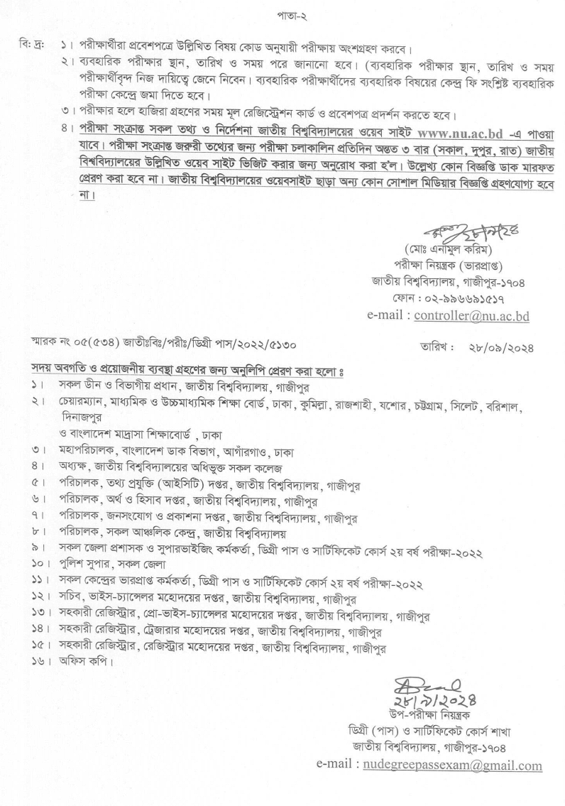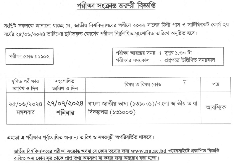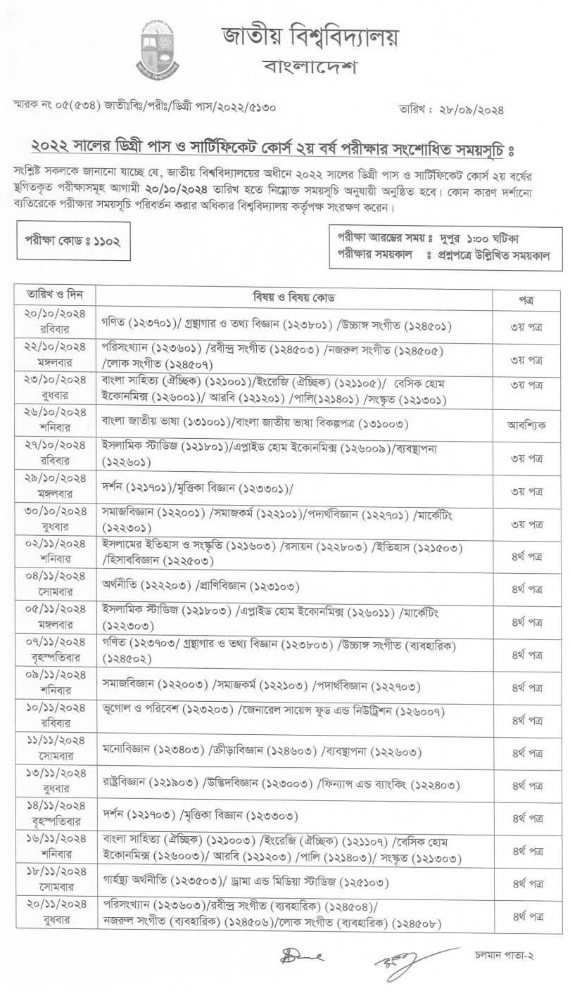 The Degree pass and certificate Course 2nd Year exam Routine 2024 Under the National University of Bangladesh was published on 4th June 2024 and revise it 28 September 2024.