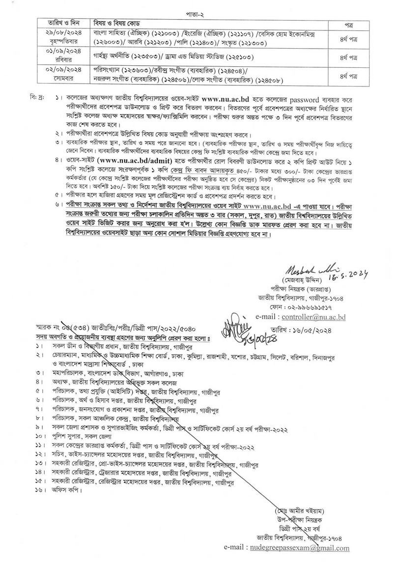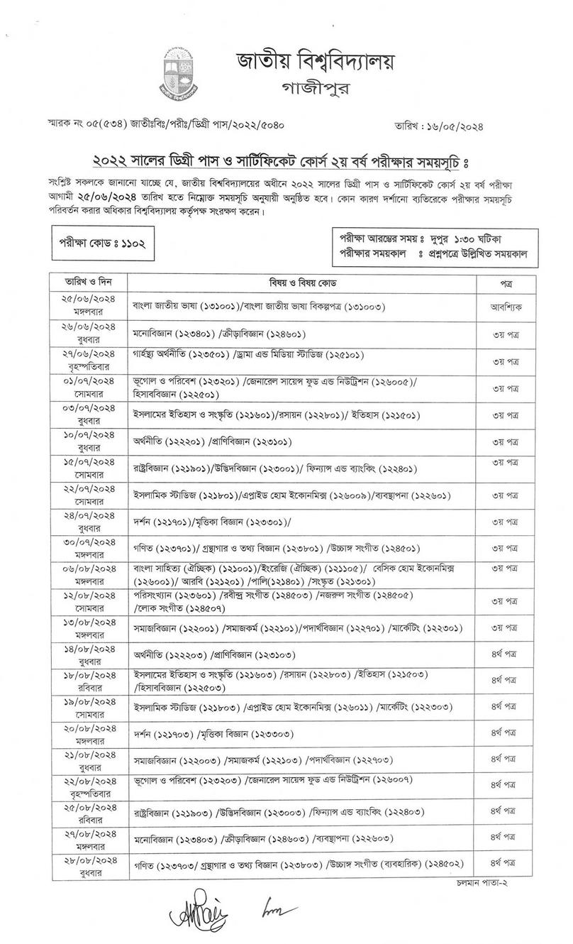 The National University of Bangladesh degree pass and certificate course 2nd year routine PDF.