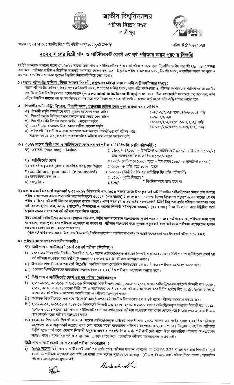 Degree 3rd year form fill-up notice 2024 for the session of 2022 has been published. According to the Notice degree 3rd year form fill-up started on 09 June 2024 and the last date will be 04 July 2024.